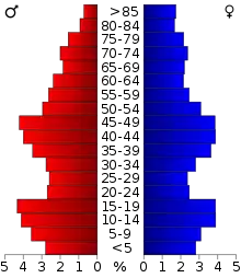 In the county, the population was spread out, with 25.20% under the age of 18, 8.40% from 18 to 24, 25.50% from 25 to 44, 23.70% from 45 to 64, and 17.20% who were 65 years of age or older. The median age was 39 years. For every 100 females there were 98.20 males. For every 100 females age 18 and over, there were 94.90 males.
