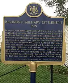 From 1818 to 1822, Richmond was managed by the Settling Branch of Upper Canada's Military Department. Life was dominated by military culture and institutions during these early years. While official plans demonstrate an optimism for its future growth and importance, this never came to pass. By the time the military relinquished control of Richmond in 1822, very few civilians had settled. In the case of Richmond, the rising importance of Bytown and the building of the Rideau Canal several kilometres east of Richmond significantly contributed to its failure to thrive.[3] By 1832, Hamnett Pinhey described the state of Richmond to the Freeholders of Carleton as, "a jail in itself." He goes on to note that, "I have known that place these thirteen years, it was then a rising place, but it has been falling ever since, and is now almost nothing; not a house has been built but many a one has fallen down and still are falling... if you get into it in the Spring, you can't get out till Summer; and if you get into it in the Fall, you must wait till the Winter, and whose fault is it but the Magistrates and Gentry of Richmond; that is to say the Shopkeepers?"[4]