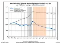 Development of population since 1875 within the current boundaries (Blue line: Population; Dotted line: Comparison to population development of Brandenburg state; Grey background: Time of Nazi rule; Red background: Time of communist rule)
