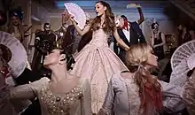 Grande wearing a pink dress in a masqueraded, costume Victorian-era inspired party while surrounded by party guests during the music video (as illustrated above).