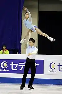 Miura/Kihara entered the Final in Turin as the top-seeded team and won the short program over American reigning World champions Knierim/Frazier by a 0.43 point margin, with the latter team having a jump error.[32] They won the free skate by a similarly narrow 0.87 point margin after Miura doubled an intended triple toe loop and Kihara put his hand down on their triple Salchow. Kihara lamented the latter mistake, saying it was "the first time in eight years" that he had done so. He added that "we were saved by the power of the audience." They were the first Japanese pair to both medal at and win the Grand Prix Final.[33][34]