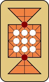 - Nine orang pieces are initially placed on the nine intersection points of the central square of the alquerque board, leaving 26 nodes unoccupied.