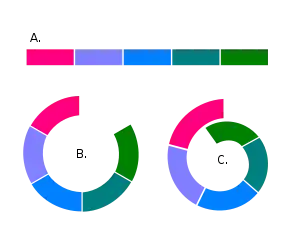 The coloured bars show natural populations (colours), varying along a cline. Such variation may occur in a line (e.g. up a mountain slope) as in A, or may wrap around as in B.