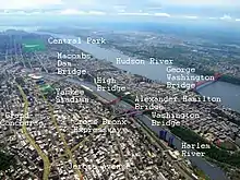 A diagram of the Harlem River. Although not labeled, the towers are the two tall buildings to the left of the river, in the bottom right corner (on the east bank).