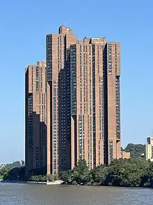 River Park Towers or the Harlem River Park Towers are two 38-story, and two 44-story residential buildings in the Bronx, New York City.[1] Completed in 1975, they became the tallest buildings in the borough, ahead of Tracey Towers and the multiple high-rises encompassing Co-op City. Currently, no other building in the Bronx has exceeded this height. Designed by Davis, Brody & Associates, both buildings were built with the intention to provide affordable, yet somewhat modern housing to the working class.[2] It is built in the same vertically articulated style with "eight-inch-square, rusty-brown 'super bricks'" as Waterside Plaza, which was built in 1973 by the same design firm.[3]