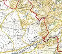 Near Templeville Road, the Poddle used to receive the artificial stream from the direction of Templeogue and Firhouse. This channel, the first stretch of City Watercourse, carried water from the River Dodder extracted at Balrothery Weir in Firhouse; as of 2020, it has been dry for at least two decades.[3] It then passes into Kimmage via Wainsfort Manor, and by Wainsfort Manor Green there is a sluice gate to manage high flow. If the water backs up, some is diverted into what is today the Lakelands Overflow culvert. Historically a surface channel, this now runs underground to cross Wainsfort Road, runs along past the Terenure College buildings and comes out at the western end of the college's lake[10] (the lake, in turn, has a tunnel connection to the River Dodder at Bushy Park, though the lakes in that park, formerly supplied with Poddle water, are now supplied solely from the Dodder itself).[3]