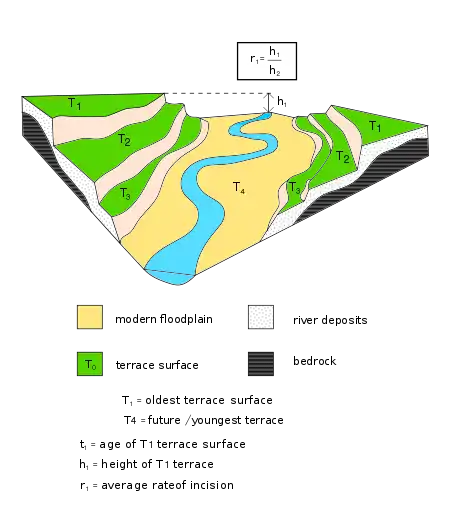 Long-lived river (fluvial) systems can produce a series of terrace surfaces over the course of their geologic lifetime. When rivers flood, sediment deposits in sheets across the floodplain and build up over time. Later, during a time of river erosion, this sediment is cut into, or incised, by the river and flushed downstream. The previous floodplain is therefore abandoned and becomes a river terrace. A river terrace is composed of an abandoned surface, or tread, and the incised surface, or riser.[2] If you can date the age of the terrace tread, one can get an estimate of the age of abandonment of that surface, and the age of incision. A simple calculation of h1/t1 can give the average rate of incision(ri), where hi = height of river terrace from river and ti = age of surface.[3] It is important to note that these rates of incision assume a constant rate of incision over the entire height and time.