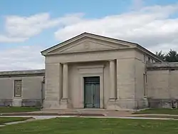 The Chapel Mausoleum was completed in 1916. The Greek Revival style structure is built of #1 Peerless Buff stone. It contains 800 single crypts, 48 companion niches and features stained glass windows.[1] The last house used by the cemetery's sexton was moved to the property in 1958. It served as the cemetery office until 1983 when the office was moved Moline Memorial Park. It ceased as the sexton's home in 1998. It is now used by the Director of Moline Parks & Recreation. Both Riverside Cemetery and Moline Memorial Park have been administered by the Moline Park and Recreation Department since 1978.[1]