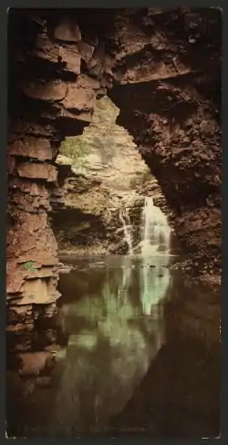 Roaring Brook begins on the Pocono Plateau.[3] It flows through a water gap known as Cobbs Gap in the Moosic Mountains and there are numerous waterfalls and rapids along it.[3][10] A waterfall known as the Nay Aug Falls is on Roaring Brook and the stream flows through the a gorge or canyon Nay Aug Gorge, which is listed on the National Register of Geologic Landmarks.[3][11] The waterfall is a cascade with a height of 22 feet (6.7 m) and cuts through a soft siltstone formation and flows over conglomerate.[11] A spring known as Chico's Spring is in the stream's watershed in Dunmore, as is a feature known as Barneys Ledge. The Madisonville Cliffs and Glen are located in the watershed in Madison Township and Covington Township. Additionally, numerous ponds, reservoirs, and water works are in the watershed.[3]