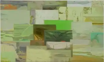 With exhibitions at Alexander and Bonin, Rubicon Gallery (Dublin) and Mummery + Schnelle (London) between 2005 and 2009, Bordo departed from multi-image postcard works, producing some of his most, understated, abstract paintings.[5][6][47] In simple, frontal works, he distilled a sense of light, space and place into a minimum of color and surface incident—brushy, wet-into-wet stretches of mint, blue or taupe overlaid with dots, daubs, tiny brushstrokes, or slabs—pushing the limits of suggestive representation (e.g., Another Day, 2005).[39][5] Art in America's Stephen Maine wrote that the "muted colors and veiled imagery" evoked an understated theatrical quality of intrigue that prompted viewers "to hang on every painterly syllable … drawn into what seems like an artworld subplot."[5] Later paintings such as Heatwave and Green Girl (both 2008) consisted simply of free, seemingly casual, lyrical brushstrokes, applied in blended colors over a monochrome ground.[6] Reviews of both shows noted the work's strong connection with nature, in palette and atmospherics, despite the high degree of abstraction.[6][39][5]