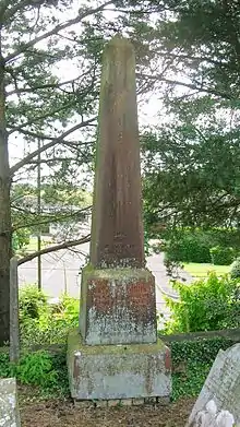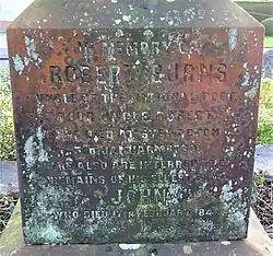 On 3 January 1789 Robert died at Stewarton[38] although for long he was thought to have died at Ellisland.[39] Robert was a popular and much respected figure in the area[40] and he is buried in a prime location in Stewarton's St Columba Church cemetery[41] where in 1910 the Stewarton Literary Society erected a memorial obelisk made of Ballochmyle red sandstone to him and to his eldest son John who had died on 17 February 1846 and is buried next to him.[14] Several other members of the family were also buried in the lair.[42]