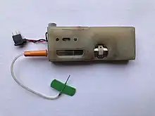 Upper: The Multiject designed for blind diabetics to self-administer precise doses of insulin. Lower: The Portaject wearable insulin infusion pump, shown with cannula attached.