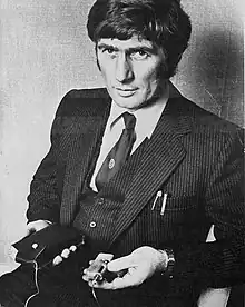 Robert Channon pictured in February 1981. In his left hand Channon holds his compact battery-powered insulin infusion pump. In his right hand he holds the Mill Hill infuser designed by Dr John Pickup and trialled at Guy's hospital.[8]