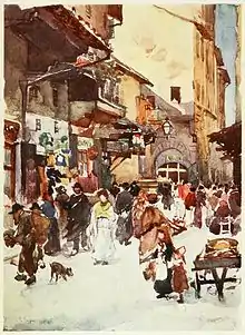 Study in the mercato vecchio of Florence in the year 1884. Watercolour, reproduced in Florence & some Tuscan cities Painted by Colonel R. C. Goff · Described by Clarissa Goff (London: A. & C. Black, 1905