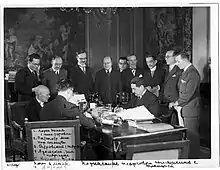 On 20 September 1938, Litvinov had delivered a strong pro-Czechoslovak speech before the League of Nations's General Assembly in Geneva, saying: "Four nations have already been sacrificed and a fifth is next on the list".[47] On 21 September 1938, Coulondre reported that the previous day the Soviet Union had promised Czechoslovakia "unconditional air support" in the event of a German invasion, through the ambassador added that he had seen no practical effort to put this promise into effect.[48] On 24 September 1938, Coulondre reported to Bonnet that the Soviets were still willing to stand by their alliance with Czechoslovakia and were criticizing President Edvard Beneš for agreeing to the Anglo-French plan to transfer the Sudetenland to Germany.[48] At the same time, Coulondre reported that Litvinov had told him that the Soviet Union would come to Czechoslovakia's defense only if the Council of the League of Nations voted for military sanctions against Germany, which he noted was tantamount to doing nothing.[49] Coulondre accused Litvinov of "taking shelter behind the League of Nations".[50] Despite Coulondre's best efforts to play up the possibility of the Soviet Union coming in to aid Czechoslovakia, the evidence to the contrary that crept in to his dispatches allowed Bonnet to argue to the French cabinet that the Moscow would do nothing to aid Prague if the crisis should come to war.[51] On 30 September 1938, the Munich Agreement was signed, putting an end to the Sudetenland crisis. The same day, Coulondre visited Fierlinger to offer him his sympathy.[52] Coulondre reported: "When I entered his study, I felt there is the coldness which penetrates one in a house where there is a dead person".[52]