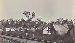 Burns was probably attracted to the Hamilton and Stawell districts by the proliferation of work opportunities offered by the construction of railways in the colony of Victoria. The rail link from Ballarat to Ararat opened in April 1875, leading to further railway works in the Ararat district as the township developed into a major rail junction.[10] In February 1876 the railway line from Ararat, north-west to Stawell was opened.[11] This line was extended to Murtoa in December 1878.[12] In April 1877 a railway to the south-west was opened, joining Ararat with Dunkeld. This line was later extended to Hamilton and Portland.[13] The railway worker, or navvy, was employed by contractors to provide the manual labour to fell trees, lay sleepers and tracks, excavate cuttings and construct embankments. The workers lived in tent camps, with only basic necessities, located near the construction works.[14][15]