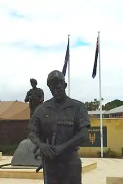 Towards the end of the 1970s Hitchcock bronzes took on a larger scale, which was particularly suited for public art commissions – the most significant of which is, almost certainly, his sculpture of Yagan. From the mid-1970s, members of the Noongar community lobbied for the erection of a statue of Yagan as part of the WAY 1979 sesquicentennial celebrations. Their requests were refused, however, after the Premier, Charles Court was advised by one prominent historian that Yagan was not important enough to warrant a statue.[2] The Noongar community then established a Yagan Committee and eventually raised sufficient funds to commission Hitchcock to create a statue. The result was a life-size statue in bronze, depicting Yagan standing naked with a spear held across his shoulders. Hitchcock's statue of Yagan was officially opened by Yagan Committee chairperson Elizabeth Hanson on 11 September 1984. It stands on Heirisson Island in the Swan River near Perth.