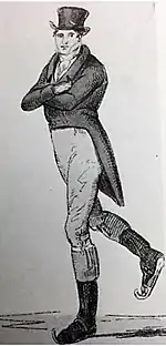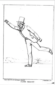 In 1772, Jones wrote and self-published The Art of Skating, the earliest book about figure skating. The book went through several reprintings and revisions and remained available until the mid-1800s.[6][8][9] Figure skating historian James R. Hines called it "a milestone in the history of figure skating".[10][2] Jones described the basic techniques of skating, which was a recreational activity at the time, before the development of figure skating as a sport in the late 1800s. He also described seven advanced figures that were skated at the time: these were "circular patterns which skaters trace on the ice"[11] that gave the sport of figure skating its name, with sketches and large colour plates of three of them.[4][12] According to Hines, the colour plates demonstrate the conservative nature of skating at the time; the clothing the skaters in them wore were "elaborate and formal"[13] (coats with tails and top hats), and one of the figures Jones describes, the flying Mercury, was inspired by mythology and "represented a nod to neoclassicism".[13]