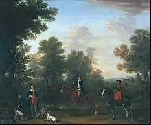 Hunting scene by John Wootton (1744), with Robert Lee on the left holding the gun, George Lee, 3rd Earl of Lichfield, his nephew, mounted in the centre