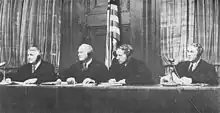The judges of the Nuremberg Military Tribunal II, Case IV: „Pohl Case“ or „WHVA Case“. Form left to right: Donald Phillips, Robert M. Toms (presiding judge), Michael A. Musmanno, John J. Speight (alternate judge). This photograph was taken by US Army photographers on behalf of the Office of Chief of Counsel for War Crimes (OCCWC) during the trial.