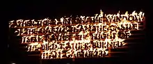 Often installed unauthorised amid industrial and urban sites, Montgomery's installations address themes such as power, love, and human kindness with sparse language and dramatic visuals.[7] These text-based conceptual pieces categorised as recycled sunlight pieces, billboard pieces, fire poems, woodcut panels, and watercolors.[8] Montgomery's cryptic and emotionally resonant poetry comments on contemporary life and affirms his personal and philosophical beliefs, which he describes as "melancholic post-Situationist", a 20th-century antiauthoritarian Marxist movement.[7]