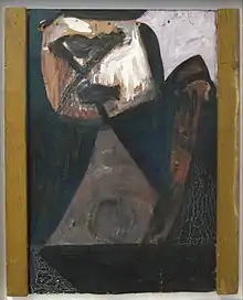 During the 1960s, Motherwell exhibited widely in both America and Europe and in 1965 he was given a major retrospective exhibition at the Museum of Modern Art; this show subsequently traveled to Amsterdam, London, Brussels, Essen, and Turin.[26] In 1962, Motherwell and Frankenthaler spent the summer at the artists' colony at Provincetown, Massachusetts, where the coastline inspired the Beside the Sea series of 64 paintings, the oil paint splashed with full force imitating the sea crashing on the shore in front of his studio.[27] The 1963 untitled oil on canvas painting in the collection of the Honolulu Museum of Art exemplifies this stage in the artist's career.