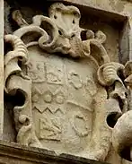 Left: Armorial of Duke family of Otterton: Per fesse argent and azure, three chaplets counterchanged; right: one of two escutcheons of arms of Rolle impaling Duke, on either side of the base of the statue of Queen Anne given to Barnstaple Corporation by Robert Rolle in 1708