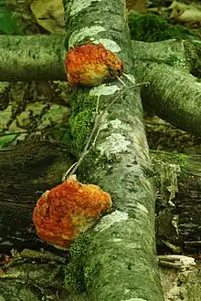 Fungus and lychens growing on a tree branch photographed at Rock City State Forest