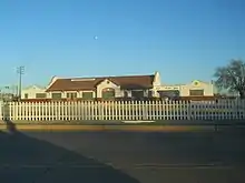 A building which is 195 feet (59 m) long and 26 feet (7.9 m) wide. The building architecture is eclectic, exhibiting both Spanish and Italian influences. The lower section of the exterior wall is brick, while there is covered with stucco. The stucco is painted white, decorated with tan painted trim. The center section has a gabled roof, with semicircular walls extending above the roof line on each end. The large window in the center is arched. Other windows have an arch design embedded in the stucco.
