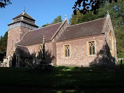 The church tower is mediaeval, but the rest of the church was rebuilt and refitted in 1859–60 by John Prichard and John Pollard Seddon in the Early English and Perpendicular styles. It contains a painted coat of arms of William III, dated 1700.[6]