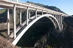 Rocky Creek Bridge[1] is a reinforced concrete open-spandrel arch bridge on the Big Sur coast of California, built in 1927, its official name is Ben Jones,[2] referred to as Rocky Creek Bridge features a reinforced-concrete, open-spandrel, fixed, parabolic-arch, a decorative cantilevered walkway, and reinforced-concrete railings in an arched-window design. It is located in Monterey County, on the State Route 1 (Cabrillo Highway) about 12 miles (19 km) south of the city of Carmel, and about a mile north of the more famous Bixby Creek Bridge. Rocky Creek Bridge is one of seven similar bridges along State Route 1 known as the Big Sur Arches, it is individually eligible for the National Register of Historic Places under Criterion A for providing important crossings for the Carmel-San Simeon Highway, originally State Route 56 (now State Route 1), and under Criterion C as an outstanding example of modern concrete arch construction with heavily inflected piers, and thin arch rings and spandrels As its name implies, it spans Rocky Creek. A turnout with limited parking space exists to the northwest of the bridge, for tourist use.
