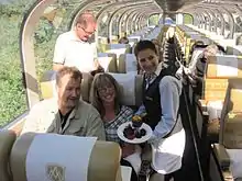 Operating on all routes except the Rockies to the Red Rocks, Rocky Mountaineer's GoldLeaf service is a custom-designed, bi-level, glass-domed coach with full-length windows and reclining seats that can be rotated to accommodate groups of four. Guests are offered hot meals prepared on board the train, served to them in the lower level dining car.[16][17]