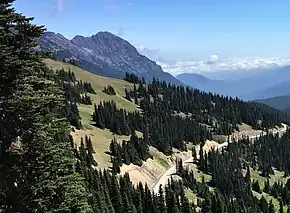Rocky Peak is a 6,218 feet (1,895 m) summit in the Olympic Mountains and is located in Clallam County of Washington state. It is situated eight miles south of Port Angeles, Washington within Olympic National Park. Its nearest higher peak is Mount Angeles, 1.87 mi (3.01 km) to the west.[1] Klahhane Ridge connects these two peaks. Travelers on the scenic Hurricane Ridge Road traverse the lower south slope of Rocky Peak en route to the Hurricane Ridge visitor center. The mountain was named Rocky Peak by local people from the time of the earliest settlers in the area.[2] Precipitation runoff from the north side of the peak drains into Rocky Creek, whereas the south slope drains into Morse Creek, thence into the Strait of Juan de Fuca.