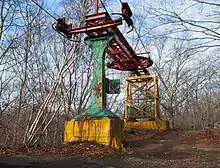 On June 26, 2011, Rocky Point was once again opened to the public and features a new asphalt mile long walking path along the shore of Narragansett Bay.[17] The Shore Dinner Hall was later demolished while the rest of the amusement area was cleared and opened to the public. The majority of the amusement park space is now an empty field for the passive use park. A few elements of the park remain, including the upper and lower stations for the Skyliner gondola ride, ruins of an old water tank, and a large arch by the entrance that was originally built for the 1964 World's Fair in Flushing, Queens, and subsequently moved to Rocky Point.[18][19][20]