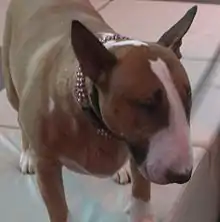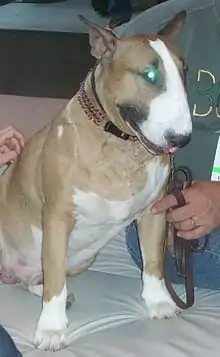 In judging for Best in Show at Westminster, Rufus was joined by a Golden Retriever (Ch. Chuckanut Party Favour O' Nove), a Dalmatian (Ch. Merry Go Round Mach Ten), a Rottweiler (Ch. Carter's Noble Shaka Zulu), a Scottish Deerhound, a Pug (Ch. Kendoric's Riversong Mulroney) and an Old English Sheepdog.[5] Of all the breeds being judged, only the Pug and the Sheepdog had previously won Best in Show. Judging was conducted by James Reynolds, with the crowd favouring the Golden Retriever. The Dalmatian was owned by Dick and Linda Stark who also own the German Shorthaired Pointer Ch. Kan-Point's VJK Autumn Roses, who won the previous year's Best in Show. When the judge announced the winner, it seemed like an upset, although the terrier group is the most successful at Westminster. On winning, Rufus became the first Colored Bull Terrier to take the title, with the only other Bull Terrier to take the title being Ch. Haymarket Faultless, a White Bull Terrier, in 1918.[6][7] Speaking of Rufus, judge James Reynolds described him as "The classic profile of a colored bull terrier."[8] Following his win, owner Barbara Bishop announced his retirement from the show ring.[8]