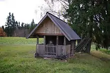 Rokina tsässon is a small, one-storied pine cross-beam building, has a square floor plan and a gable roof, the outer measurements of which together with the entrance-room are 390 x 230 cm. The beam part of the building is square (242 x 240 cm), surface area on the inside is about 3 m2. Tsässon has an open entrance-room (about 4 m2) with round logs that have slightly profiled angles that support the roof and about a metre high fence made from upright boarding. The gate is made from vertical fencing with the upper part of it arched. There is a cross on the highest fence board in the middle of the gate. The height of the building from the ground up to where the rafter and the wall unite is 160 cm and the height up to the ridge is 310 cm. The ridge has a simple wooden cross on it. The logs of the building are standing on granite stones and are tied in the corners by axe hewn halving. The dimensions of the door are 64 x 141 cm. The door is made up from three axe-hewn wide boards fixed on the crosspiece and painted over with red paint. The door opens on the inside. The vertical supporting posts are axe-hewn; the log above the door is hewn curved. The door is fixed on the supporting posts by forged 30 cm hinges that are not original. There is a cutting made inside the beams above the door for the entry icon. There are no windows. Originally, the building had a board roof, as can be seen from the raising-plate construction. During the last renovation, the eternit roof was replaced once again by a board roof. The eternit roof was put on the building after 1975; according to the Dr. Fr. R. Kreutzwald Memorial Museum 1974 notes (Kupp 1974) the building had a shattered board roof. It is also noted that in the earlier years, the tsässon was painted red, but the paint had worn out. The building on the photograph taken around the 1920s had no boarding, with the board roof leaning on lengthwise raising-plates and no entrance-room. There is a wooden Latin cross in the place of the former recess for an icon, under the gables in the upper frontal part of the building. In the 1974 photo, the building has an entrance-room that has been preserved up to today.[1]