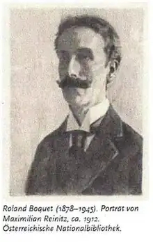 Bocquet moved to Dresden in 1900 and whilst earning his living as a teacher of Music and Mathematics entered the city's bohemian artistic circle. His compositions date from 1902, writing virtuoso piano pieces and Lieder drawn from the poetry of Baudelaire, Hermann Hesse, Friedrich Nietzsche, Max Dauthendey and others.[3] The British composer Arnold Bax who had known Bocquet at the Royal Academy, spent some time with him during a visit to Dresden in 1906 and described him thus: 'Roland Bocquet was the writer of many very skilful but clearly Strauss-derived lieder. Noticeably handsome, black-haired and moustached, blue-eyed, straight of nose and with a peculiarly beautiful speaking voice, he'd been settled in Dresden for some years and spoke German like a native. He took himself rather Byronically, and posed as a blase cynic.[4]