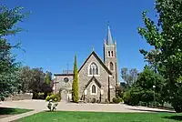 St Christopher's was built as the first parish church in Canberra by the first priest, Father Patrick Haydon, although the beginnings of Catholic life in the district go back to 1862 when the Diocese of Goulburn was erected.[3] The parish was originally part of St Gregory's Parish, Queanbeyan, until 1912. Following the erection of the Diocese of Wagga Wagga in 1918, the parish was transferred to the Diocese of Goulburn.[4] A foundation stone was laid by Archbishop Kelly in 1927 for a church and school. The following year St Christopher's became an independent parish with the first classes taught in the adjacent school, and the open day attended by the Prime Minister, Bruce. In 1930 a large cathedral was proposed for the site behind Regatta Point, but economic circumstances and World War II made this impractical.[5] A foundation stone for the cathedral was laid in 1938 by Archbishop of Sydney Gilroy in a ceremony which included Joseph Lyons and James Scullin. The choice of St Christopher as patron saint was selected on the basis that Canberra would be a place to which many travellers would come. In the presence of Robert Menzies, the Apostolic Delegate, Archbishop Panico, opened the parish church in 1939.[3]