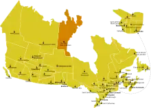 It includes the northeastern part of the federal Province of Manitoba and all except the western extremity of the Territory of Nunavut.