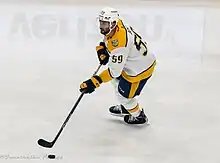 Prior to the start of the 2018–19 season, Josi was ranked among the top 10 NHL Defensemen by NHL Network's hockey pundits.[94] He began the season strong, maintaining a five-game point streak through 12 November.[97] While the Predators began suffering injuries in December, Josi ranked second on the team with five goals and 18 assists for 23 points.[98] By January, Josi had tallied 18 points through 23 games and ranked second on the team and first among team defensemen in points with 29. He was subsequently named to his second NHL All-Star Game alongside Pekka Rinne.[99] Leading up to the All-Star Game, Josi ranked 10th in the NHL among defensemen with 36 points and third in assists per 60 at 1.28, behind Tyson Barrie.[100] Josi continued to rank second behind centre Ryan Johansen on the Predators through February with 14 goals and 37 assists for 51 points through 67 games.[101] The Predators won the Central Division for the second consecutive season and faced off against the Dallas Stars in the Western Conference First Round of the 2019 Stanley Cup playoffs.[102] Josi tallied two goals and two assists for four points through six games as the Stars eliminated the Predators.[103]