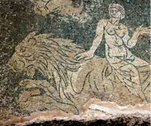 Room 9 of the frigidarium suite (9 & 25) has a mosaic floor dated to the 3rd century of large green and white tesserae of different shades depicting a marine thiasos of four Nereids riding a sea monster in the form of a horse, lion, bull and a tiger all terminating in fish tails. A drain was dug through it during the last building phase but never repaired. On the north side of the room is a large rectangular pool on the west side of which is a small space with a hole for a bench perhaps for a latrine. Room 25 is next to Room 9 and is paved with exquisite marble opus sectile and has walls veneered in marble some of which is still in place. The upper parts of the walls were frescoed. A huge cold bath in the south side of the room is paved with a monochrome mosaic and its walls tiled with 1.5 m high marble slabs. Three windows from this pool opened onto the garden, and the room also had a vaulted ceiling with mosaic imitating the sky.