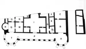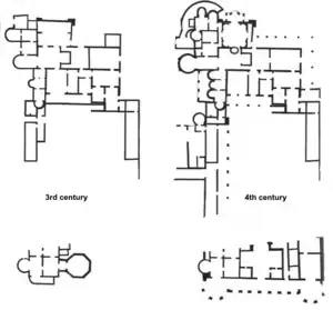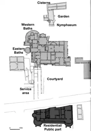 The oldest villa building dates to the 1st century AD, and nine phases of later modification have been identified. The most grandiose development was between the 3rd and 4th centuries with the addition of a monumental residential area, including the sumptuous apsidal Room I with rich floors and exotic marble veneers.[4] Other modifications included two sets of monumental baths: the Western and the Eastern Baths, and all the rooms of the grander Western Baths were more elegantly arranged with the addition of apses and expensive floor mosaics.