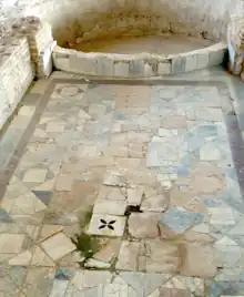 The calidarium suite (24, 36 and 29) has a hypocaust heating system with clay pipes in the walls. Room 24 has two apses on opposing sides for stone or marble benches. Room 36 has two heated pools (32 and 33), both veneered in exotic marble, and a floor with a complex, polychrome geometric mosaic. Room 29 is octagonal with an opus signinum floor covering a damaged mosaic floor with a polychrome motif of entwined circles containing stylised flowers. The ceiling was decorated with a glittering mosaic since many glassy tesserae were found in the debris of this room.