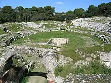 The amphitheatre is located in the ancient suburb of Neapolis, in what is now an archaeological park, near the Greek theatre and the Altar of Hieron. The amphitheatre is on a different orientation to these other structures and probably follows the lines of an urban plan developed in the late classical period, which is reflected by the street discovered near the Sanctuary of Demeter in the suburb of Achradina. The main road from Achradina to Neapolis led up to the amphitheatre through an Augustan period triumphal arch, whose foundations are still in situ. Between the arch and the amphitheatre, there was a monumental fountain, fed by a large cistern which has not yet been identified. A separate cistern provided water to the amphitheatre itself; it is preserved under the nearby church of San Nicola.[1]