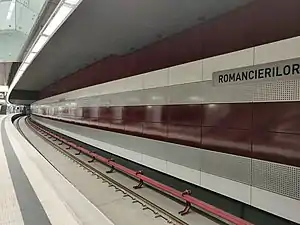 Romancierilor is a station on line M5 of Bucharest Metro. The adjacent stations are Parc Drumul Taberei (towards Eroilor), Valea Ialomiței, and Constantin Brâncuși (towards Râul Doamnei). The station was opened on 15 September 2020 as part of the inaugural section of M5, from Eroilor to Valea Ialomiței and Râul Doamnei.[1]
