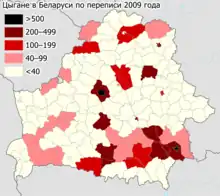 Since Belarus has become independent, the living conditions of the Romani community has remained poor, and education remains minimal; in 2009, only 28 Roma had graduated from higher education, as per the census. As of the 2009 census, 7,079 Roma live in Belarus, but it has been commonly claimed that the population is higher, with some estimates going as high as 60,000.[9] The largest number of Roma is in Gomel Region, at 2,501 people.[10]