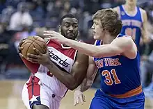 After going undrafted in the 2016 NBA draft, Baker joined the New York Knicks for the 2016 NBA Summer League.[8] Despite a scattered Summer League campaign,[9] Baker signed with the Knicks on August 1, 2016,[10] and secured an opening-night roster spot.[9] He made his debut for the Knicks in their season opener on October 25, 2016, recording five points and one rebound in seven minutes off the bench in a 117–88 loss to the Cleveland Cavaliers.[11] On December 15, 2016, he scored a career-high 13 points in a 103–90 loss to the Golden State Warriors.[12] On January 16, 2017, he made his first career start for the Knicks and subsequently scored 12 points in a 108–107 loss to the Atlanta Hawks.[12] During his rookie and sophomore seasons, in which he became a fan favorite, he was assigned multiple times to New York's D-League/G League affiliate, the Westchester Knicks.[13][14]