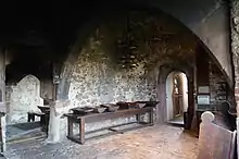 In the late 14th or early 15th century, the hall building was enclosed by a bailey on its south and west sides. This bailey originally featured three semicircular shell towers. The northern tower was later heightened to serve as a stair tower for the bakehouse. The original third gatehouse was likely built around the same time as the kennel.[34]