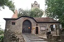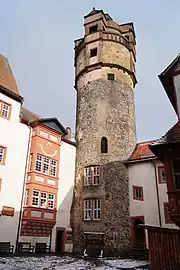 The "Witches' Tower" was so named due to the tower stump of the high fortification of the outer castle, adjoining the Marstall to the southwest. In 1599, a woman accused of witchcraft was imprisoned there. Dates on an ogival portal in the basement and an embrasure on the outside indicate the tower's construction dates of 1550 and 1549, respectively. The prison was located only in the basement of the semicircular tower. At the top, it features a weir platform, which provides a good view of the actual height of the outer castle wall and the different types of embrasures.[36]