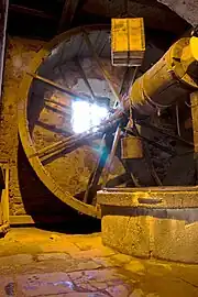 The well house to the north of the gateway underwent several modifications. Initially designed as a guardroom for the gate, a triangular bay window was added to the north of the gate in 1529, and this year can also be found at the entrance to the guardroom. In 1550, the triangular porch north of the gate was removed to connect a weir walk. In the mid-16th century, with advancements in mining technology allowing for such construction, the castle well was inserted into the gatehouse.[32] Access to the well room is through the gate passage. The upper layers of the 96-meter-deep well are made of ashlars, and pincer holes and stonemason's marks are visible. The water surface is located at a depth of 84 meters, although the well originally had a depth of 125 meters.[21] Behind the well is the wooden turning wheel from the 16th century, which was operated manually. To install it, part of the masonry and the entire false ceiling of the former upper floor of the guardroom had to be removed.[31]